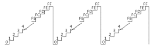 위 모양과 같이 톱니파처럼 생긴 신호를 활용하여 PWM 신호를 만들어 내는 모드를 Fast PWM이라고 한다. 이때 톱니파는 타이머/카운터가 세준 클럭 개수이다. 0~255(16진수: FF)까지 세주고 255을 넘어가면 0에서 다시 세주기 때문에 그래프로 그렸을 때 저렇게 보이는 것이다.