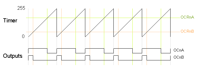 -Fast PWM에서 카운터는 0에서 255로 증가했다가 256이 되면 다시 0부터 시작한다.