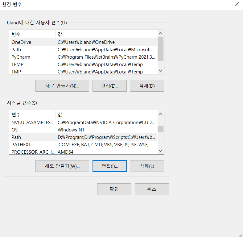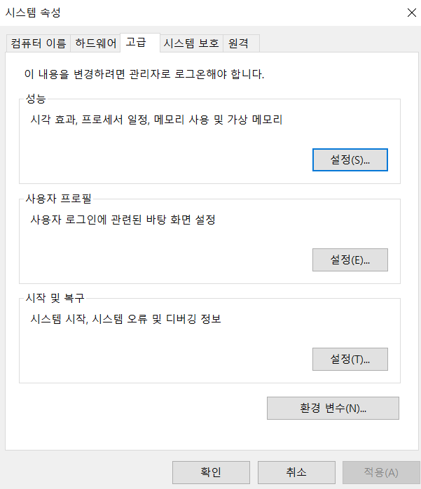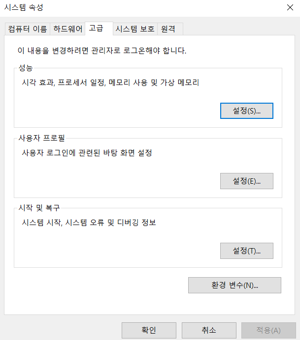 윈도우10 검색창에 '시스템 환경'이라고 입력한다. 그러면 위와 같이 '시스템 환경 변수 편집'이 뜨고, 그걸 누르면 오른쪽과 같은 '시스템 속성' 창이 뜬다. 이때 '시스템 속성'창에서 아래에 있는 '환경 변수(N)...'을 누르면 아래 왼쪽과 같이 창이 뜨게 될 것이다.