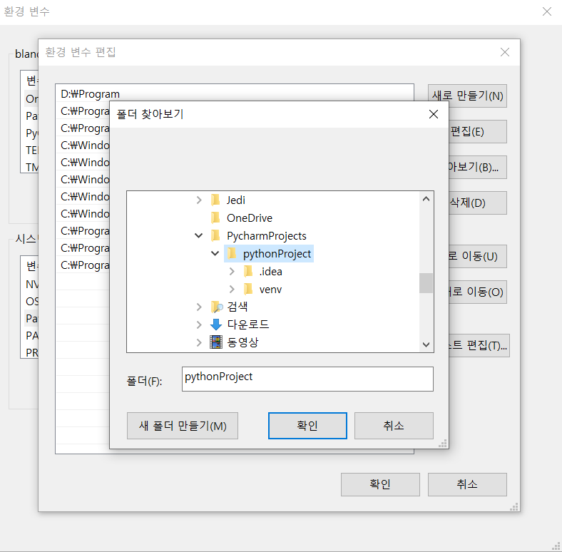 왼쪽 그림의 '시스템 변수(S)' 항목에서 Path를 찾은 다음 더블클릭한다. 그러면 오른쪽 창과 같이 '환경 변수 편집'창이 뜬다. 그러면 새로 만들기(N) -> 찾아보기(B)... 순으로 눌러 '파일명.py'이 있는 폴더를 추가해준다.