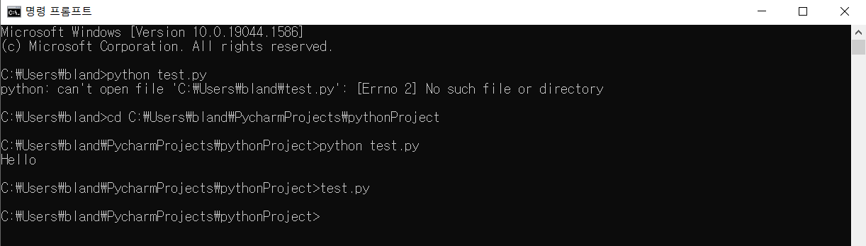 위 그림은 파이썬 실행 파일을 실행시키는 명령어 'python 파일명.py'를 쓸 때의 주의점을 준다. 프롬프트의 주소를 지정을 안 하고 바로 python 파일명.py을 입력하면 해당 파이썬 파일을 현재 폴더에서 찾을 수 없다는 경고를 내보낸다. 따라서 이 명령어를 쓸 때는 반드시 해당 폴더의 주소로 프롬프트(>>>)를 옮겨준 다음에 'python 파일명.py'를 써야 해당 파일이 제대로 실행된다. 위 그림에서 Hello라고 표시된 줄은 test.py의 실행 결과다.