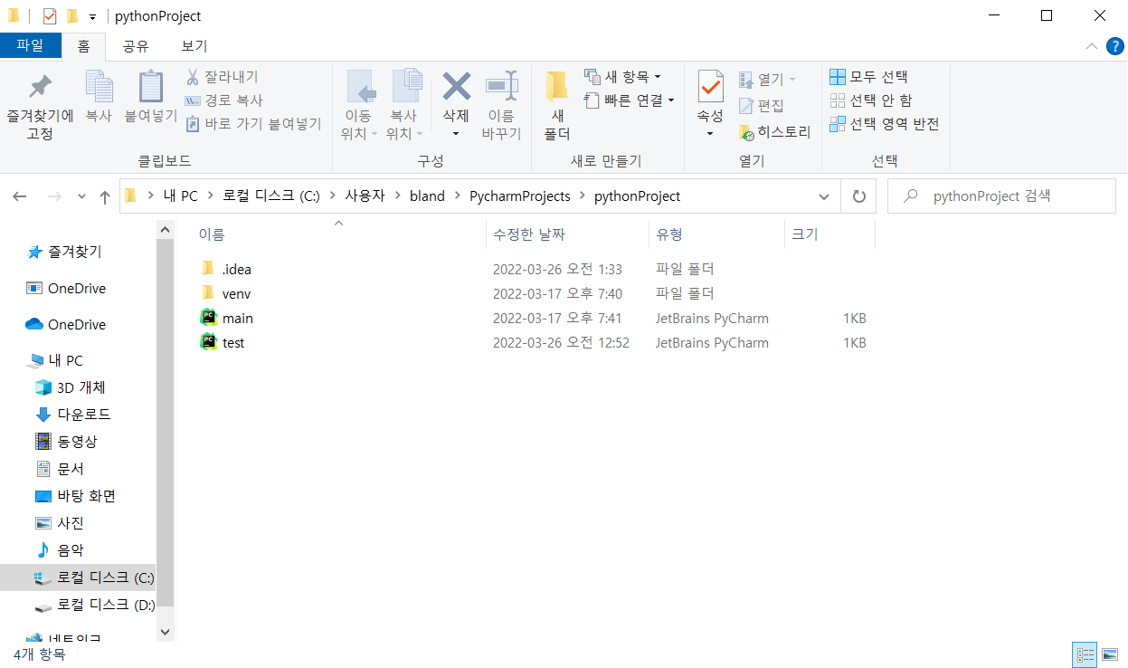 본인은 파이참(PyCharm)을 이용하는데, 오른쪽 그림과 같이 파이썬 실행파일인 '파일명.py'를 로컬 디스크(C:)의 PythonProject란 폴더에 저장해 놓았으므로 해당 폴더를 추가하여 주었다.