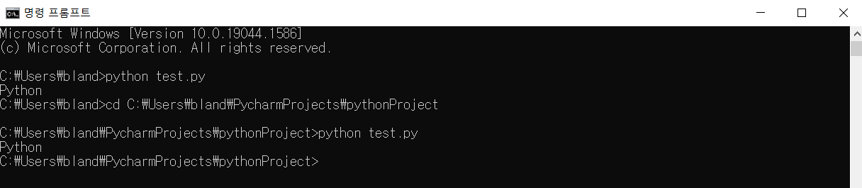 cmd창에서 위와 같이 python 파일명.py를 써서 실행하면 Python이라는 응답이 나오는 것을 볼 수 있다. 여기서 파일명은 test라고 지었다. 게다가 심지어 'cd C:\해당 파이썬 파일이 있는 폴더명'를 써서 해당 파이썬 파일이 있는 폴더쪽으로 주소로 옮겨 명령어 'python 파일명.py'를 써도 Python이라는 동일한 응답만 돌아온다. 이러한 문제들은 실행시키고자 하는 파이썬 실행파일 '파일명.py'이 있는 폴더를 윈도우10 시스템 변수에 경로(PATH)로 추가하지 않았기 때문에 발생한 다. 따라서 해당 파이썬 파일이 있는 폴더를 윈도우10 시스템 변수에 경로(PATH)로 추가한다면 이 문제는 해결된다.
