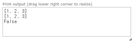 실행 결과 마지막 줄에 False라고 나와있는데, 이것은 위 코드에서 print(a is b) 구문 때문에 나온 것이다. a is b는 a와 b가 동일한 객체를 가리키고 있으면 True(참)를, 아니라면 False(거짓)를 반환한다. 다시 말해서, a is b는 id(a)와 id(b) 값이 같은지 아닌지를 판별하여 준다. 따라서 a is b의 실행 결과가 False인 것은 변수 a와 b가 가리키는 메모리 주소가 서로 다르기 때문임을 알 수 있다.