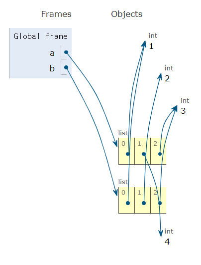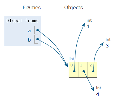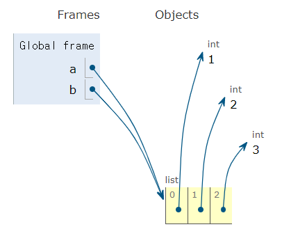 코드 실행 결과를 시각적으로 보여준 위 그림을 보면 쉽게 이해할 수 있을 것이다. Frames에 있는 두 변수 a, b의 화살표가 동일한 list를 가리키고 있는 것이 보이는가? 이는 두 변수 a, b가 이름만 다를뿐 같은 값을 참조한다는 것을 뜻한다.
